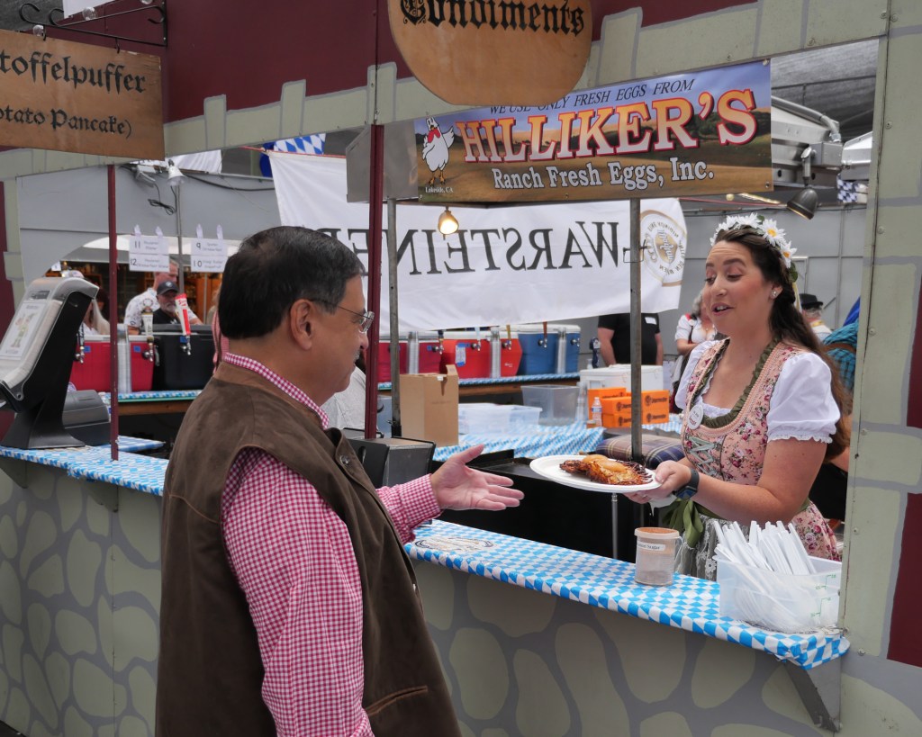 Enjoy German food such as bratwurst, ox-on-the-spit, potato pancakes, sauerkraut, red cabbage, potato salad, salted pretzels, and a variety of European pastries. Let a great selection of German beers and liquors, water and soft drinks, quench your thirst while you watch and participate in traditional folk dancing, choir recitals, drama routines, stein-holding competitions, and interactive musical entertainment. Games, contests and prizes, a Kid Zone and a variety of shopping booths line the patio for additional all-ages fun.